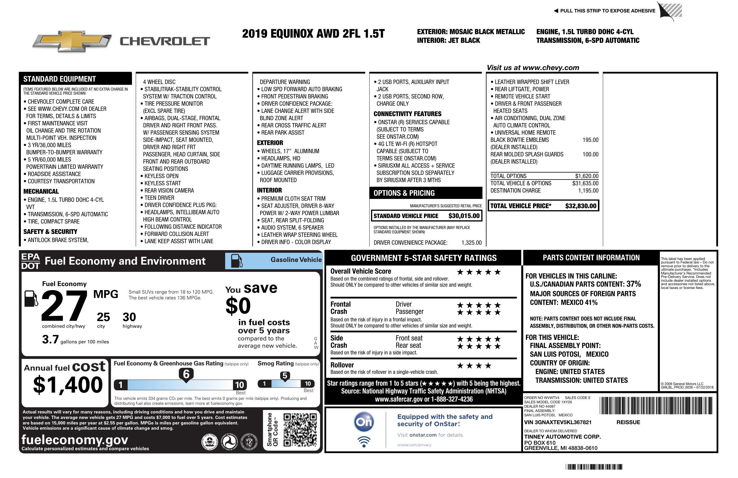 additional equipment [ZQ2] driver convenience package $1,325.00